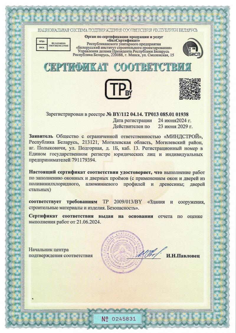 Сертификат соответствия по заполнению оконных проемов и дверей